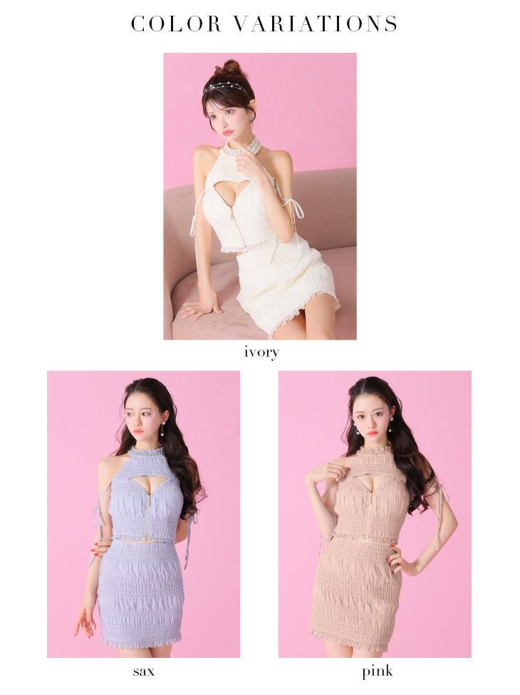 可愛さの中にもセクシーさ漂う♡ [ROBEdeFLEURS/ローブドフルール] 高級 ホルターネック バストカット ジップ シャーリング シフォン セットアップ 谷間魅せ タイトミニドレス (伊藤舞雪着用)