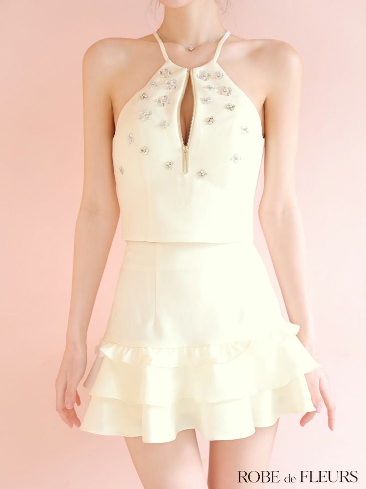 5. 予約商品【5月中旬入荷予定】[ROBEdeFLEURS/ローブドフルール] 高級 ブランド Aラインミニドレス セットアップ ホルターネック ジップ フリル ビジュー