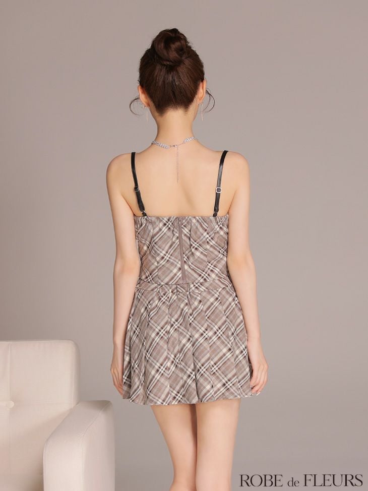 5. 予約商品【4月中旬入荷予定】[ROBEdeFLEURS/ローブドフルール] 高級 ブランド Aラインミニドレス 谷間 セットアップ チェック柄 キャミソール ジップ バストリボン プリーツ