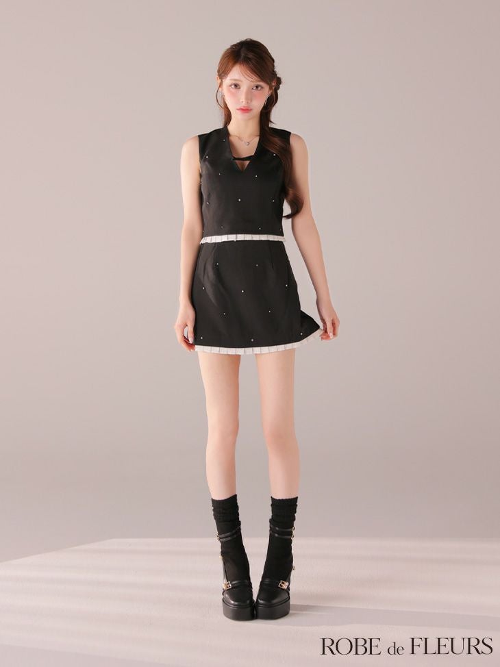 ピュアな可愛さを演出♡ [ROBEdeFLEURS/ローブドフルール] 高級 ブランド Aラインミニドレス 谷間 セットアップ ノースリーブ ワンカラー ストーン バストリボン付き