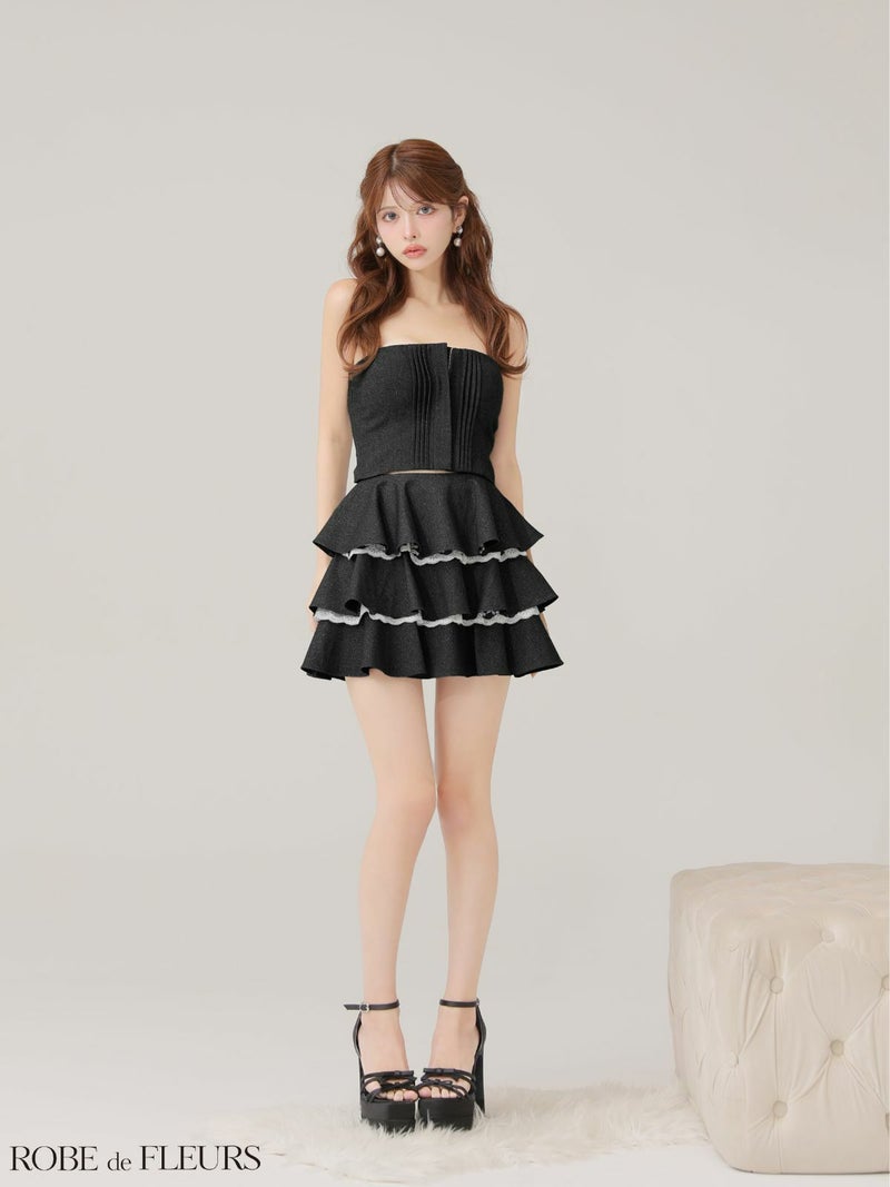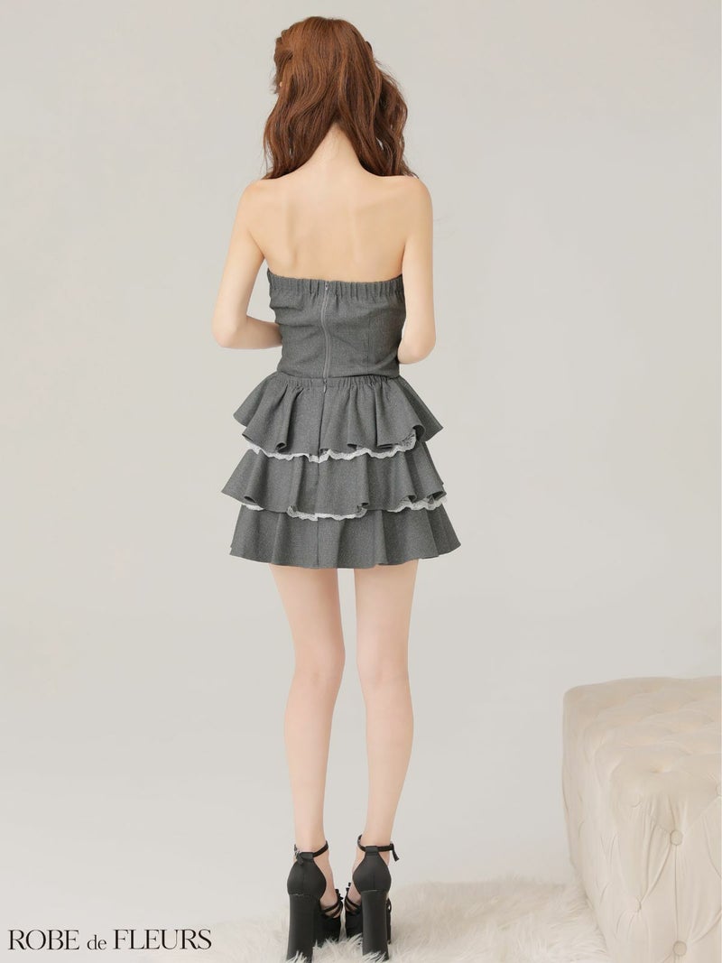 cuteなフリルが目を惹く♡ [ROBEdeFLEURS/ローブドフルール] 高級 ブランド Aラインミニドレス 谷間 セットアップ ジップ ベアデザイン ティアード フリル レース ラメ
