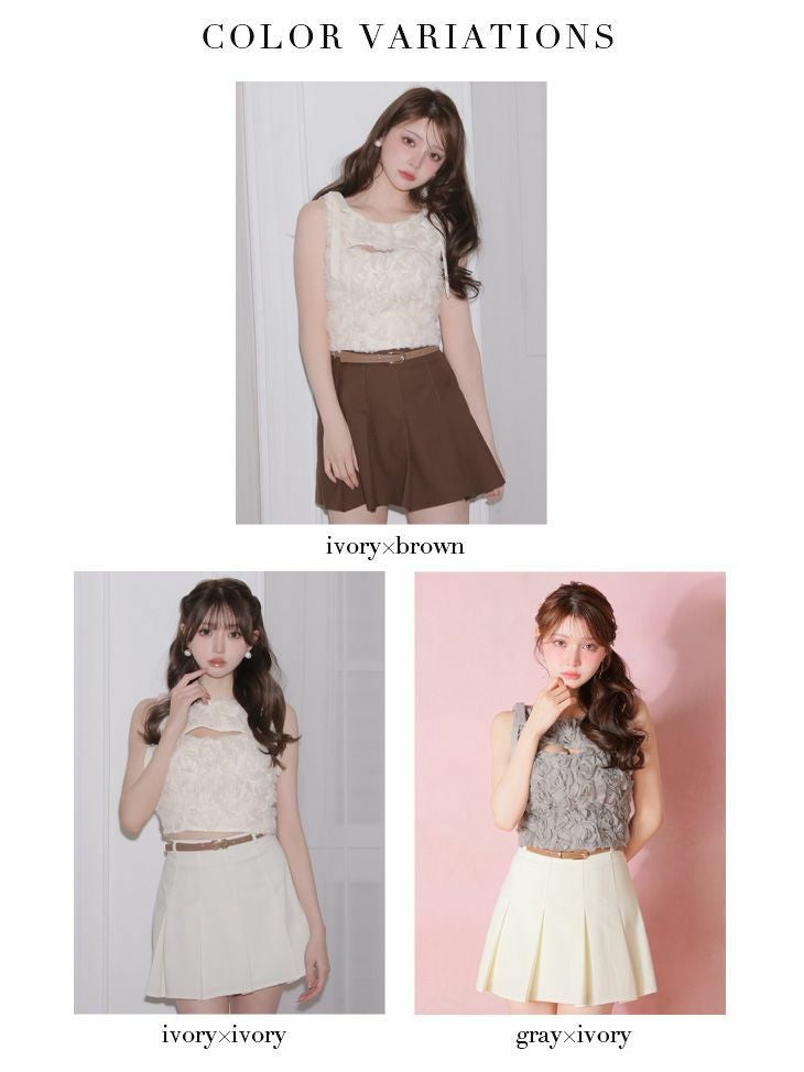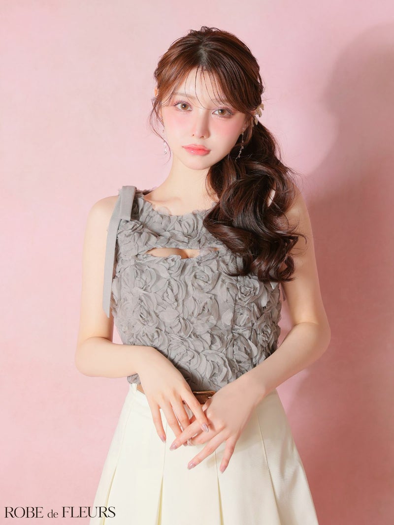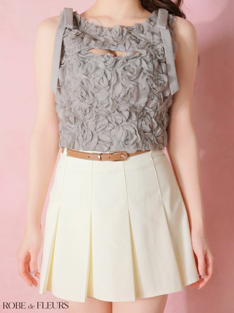 トレンド感溢れるセットアップ♡ [ROBEdeFLEURS/ローブドフルール] 高級 ブランド Aラインミニドレス セットアップ ノースリーブ バストカット 立体フラワーレース ショルダーリボン プリーツ ウエストベルト付き