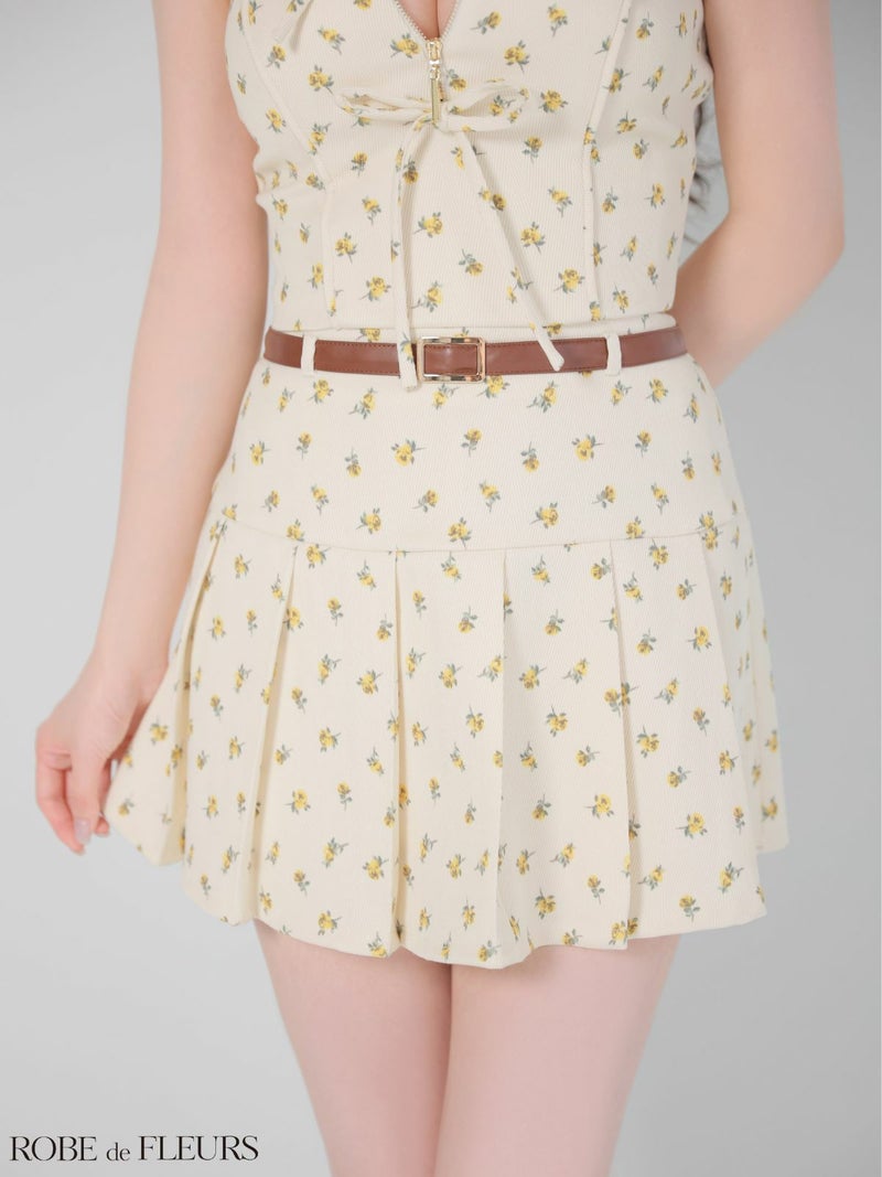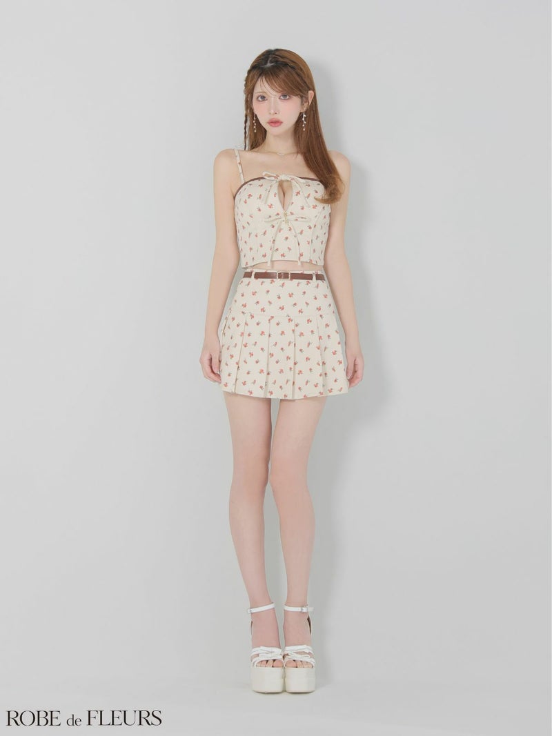 4. [ROBEdeFLEURS/ローブドフルール] 高級 ブランド フレアミニドレス セットアップ 谷間 キャミソール 2way ジップ レザーウエストベルト 花柄 リボン プリーツ