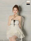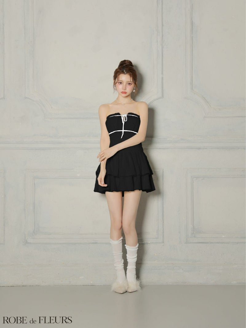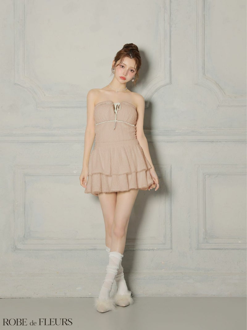 5. [ROBEdeFLEURS/ローブドフルール] 高級 ブランド Aラインミニドレス 谷間 セットアップ 胸元リボン ベアデザイン シャギーニット フリル ティアード