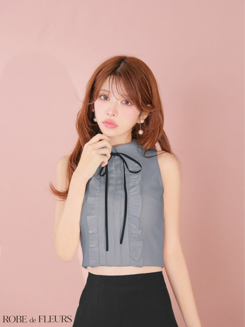 5. [ROBEdeFLEURS/ローブドフルール] 高級 ブランド Aラインミニドレス セットアップ 胸元カバー ノースリーブ ネックリボン 襟付き プリーツ 裾フリル