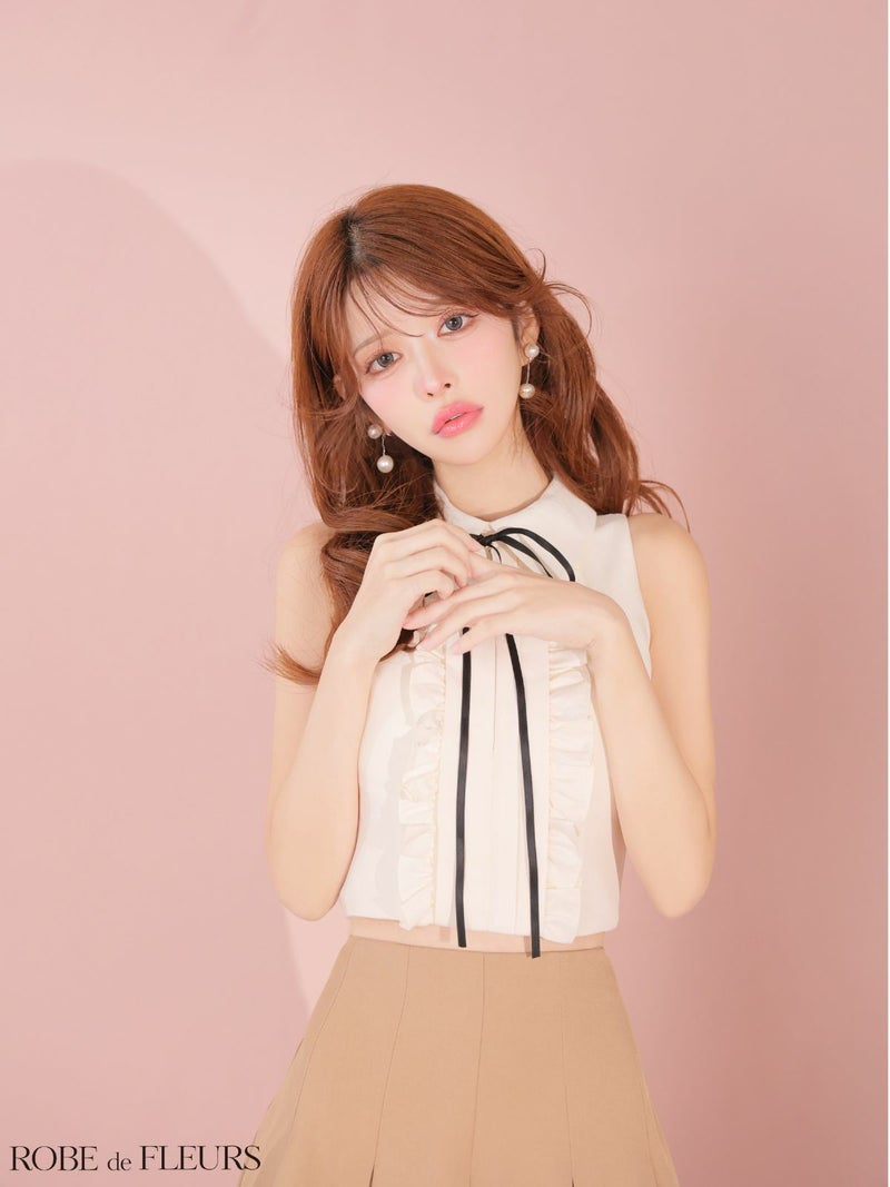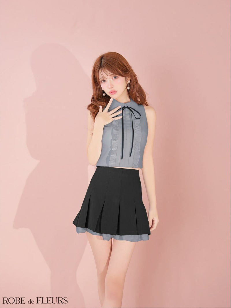 チラ見えするフリルがcute♡ [ROBEdeFLEURS/ローブドフルール] 高級 ブランド Aラインミニドレス セットアップ 胸元カバー ノースリーブ ネックリボン 襟付き プリーツ 裾フリル