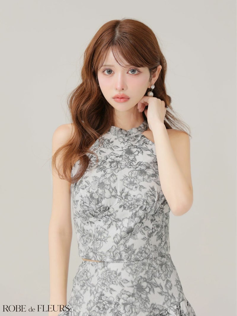 5. [ROBEdeFLEURS/ローブドフルール] 高級 ブランド Aラインミニドレス セットアップ 胸元カバー ホルターネック 背中魅せ バックリボン 花柄ジャガード バルーンスカート