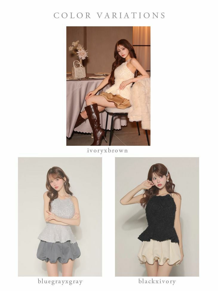 5. 予約商品【5月上旬入荷予定】[ROBEdeFLEURS/ローブドフルール] 高級 ブランド Aラインミニドレス セットアップ 背中魅せ ホルターネック フラワーモチーフ バルーンスカート