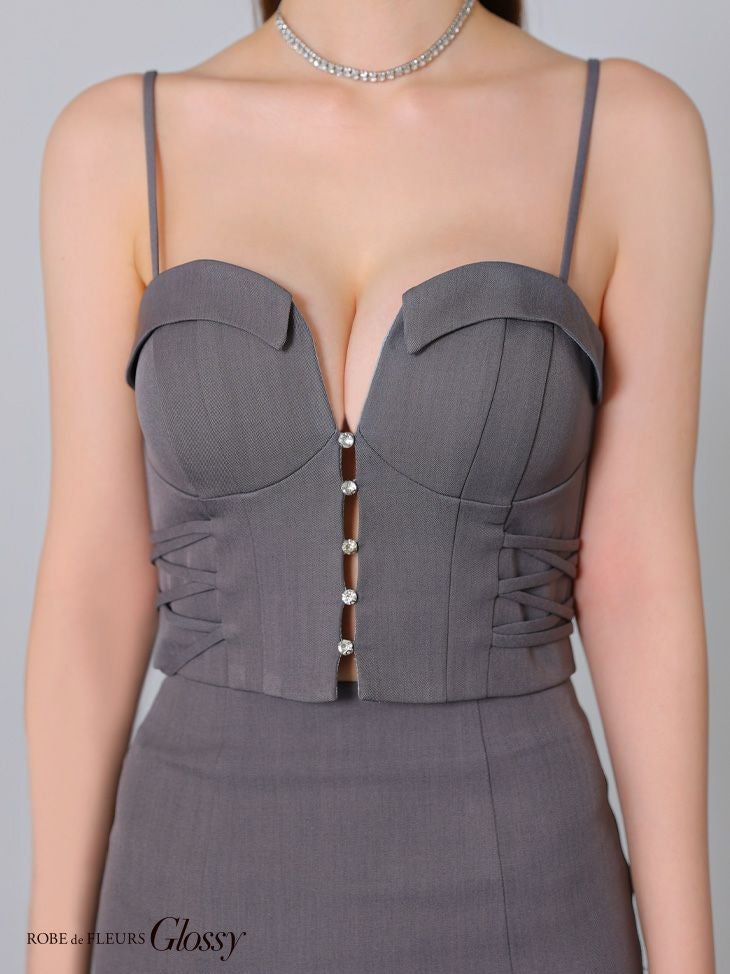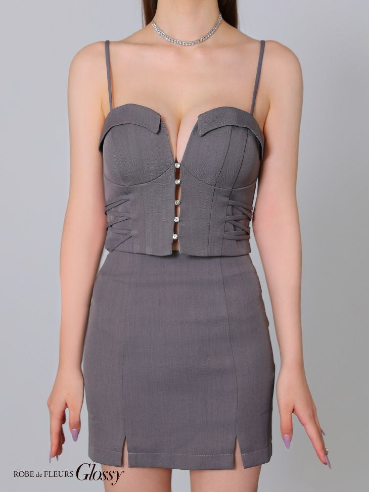 他の画像を見る フロントビジューが煌めくデザイン☆ [ROBEdeFLEURSGlossy/ローブドフルールグロッシー] 高級 セットアップ キャミソール バストカット サイド編み上げ ウエストバックリボン ビジュー 谷間魅せ タイトミニドレス ¥ 29,480 税込 お気に入りに追加