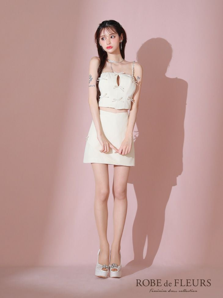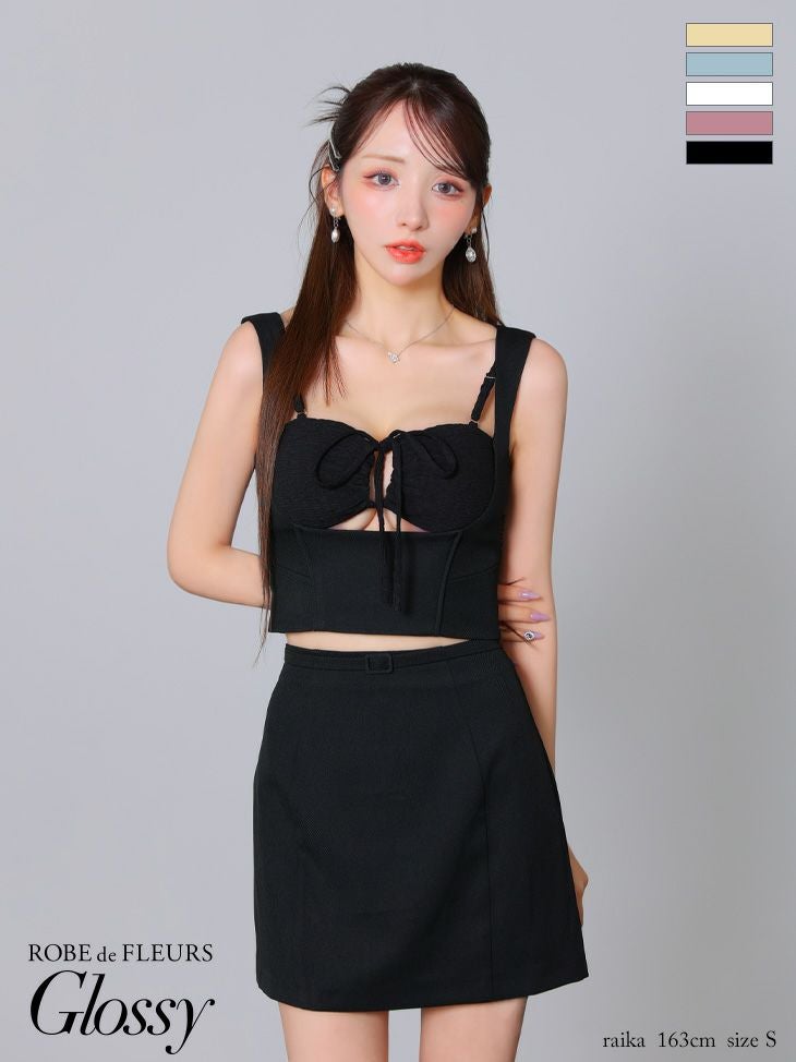 他の画像を見る リボンがキュートなセットアップ☆ [ROBEdeFLEURS/ローブドフルール] 高級 ビジュー バストカット キャミソール セットアップ リボン 谷間魅せ タイトミニドレス ¥ 27,280 税込 お気に入りに追加
