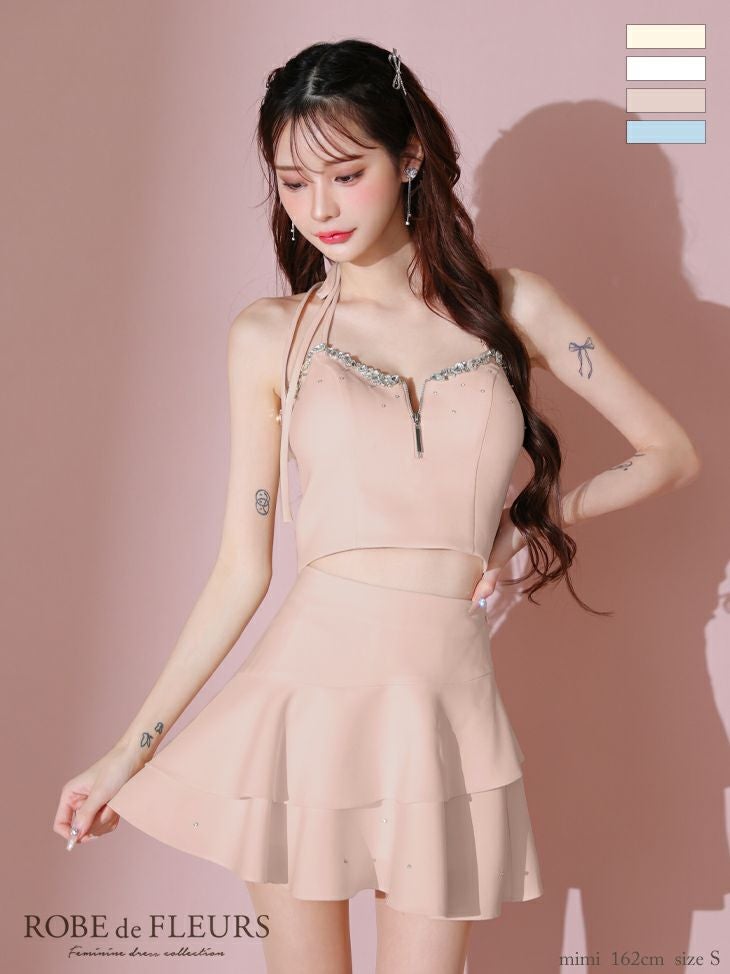 他の画像を見る 女の子の可愛さを詰め込んだ一着☆ 予約商品【5月中旬入荷予定】[ROBEdeFLEURS/ローブドフルール] 高級ホルターネックアシンメトリーリボンジップセットアップビジューフリルフレアミニドレス ¥ 28,380 税込 お気に入りに追加