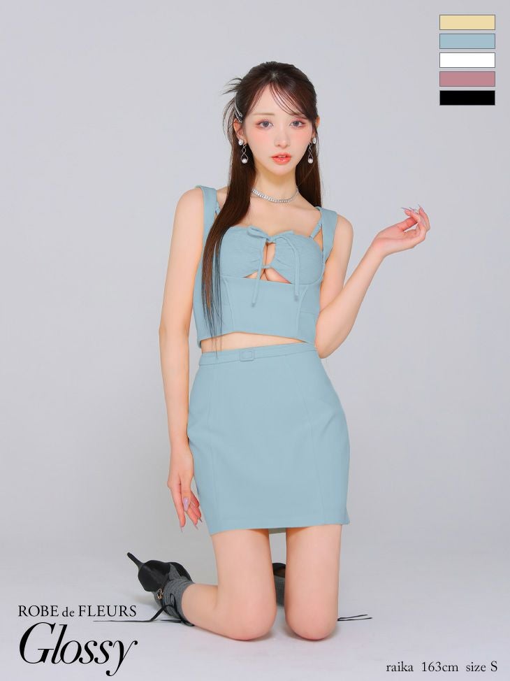 他の画像を見る パステルカラーで華やかな印象に☆ [ROBEdeFLEURSGlossy/ローブドフルールグロッシー] 高級 バストカット ノースリーブ セットアップ ウエストベルト ワンカラー 谷間魅せ タイトミニドレス ¥ 26,180 税込 お気に入りに追加
