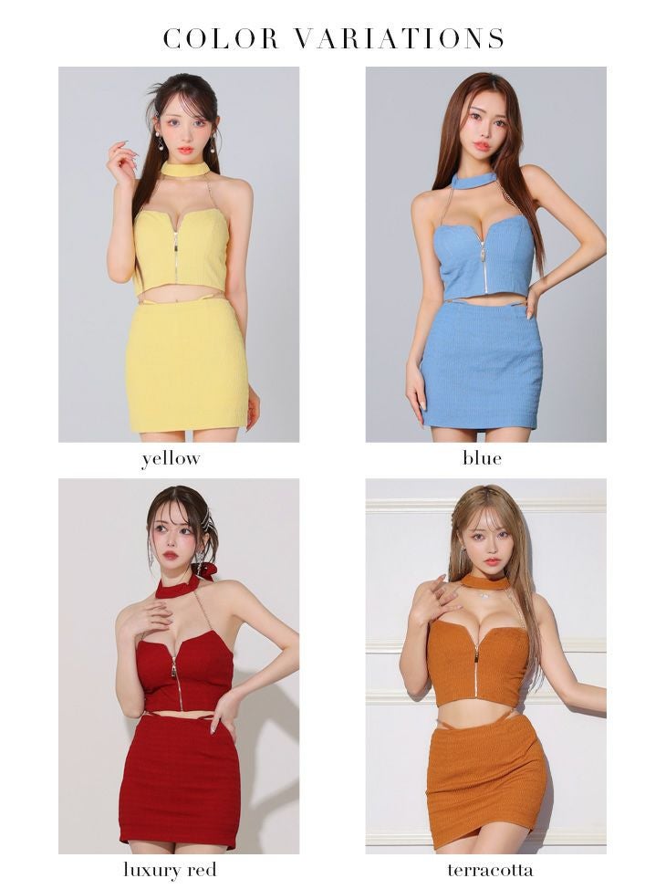 他の画像を見る 魅力を引き出すデザイン☆ [ROBEdeFLEURSGlossy/ローブドフルールグロッシー] 高級 ブランド タイトミニドレス セットアップ ホルターネック フロントジップ ワンカラー リブニット ¥ 26,180 税込 お気に入りに追加