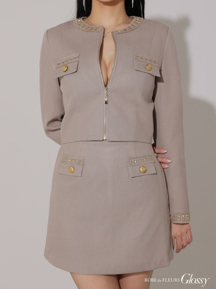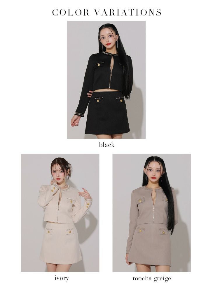 他の画像を見る ゴールドの装飾が高級感溢れる☆ [ROBEdeFLEURSGlossy/ローブドフルールグロッシー] 高級長袖 袖ありジャケット風ツイードセットアップジップゴールドデザインフレアミニドレス ¥ 32,780 税込 お気に入りに追加