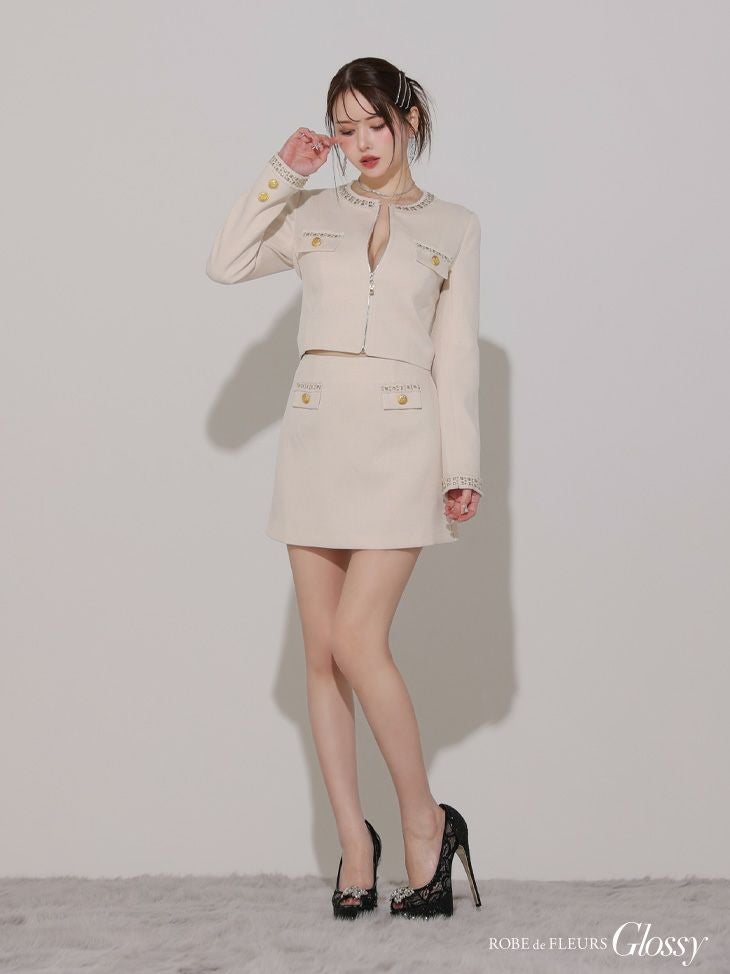 他の画像を見る 大人可愛いデザイン☆ [ROBEdeFLEURSGlossy/ローブドフルールグロッシー] 高級長袖 袖ありジャケット風ツイードセットアップジップゴールドデザインフレアミニドレス ¥ 32,780 税込 お気に入りに追加