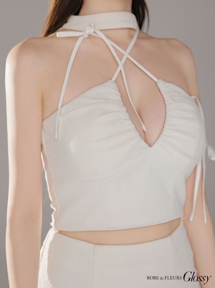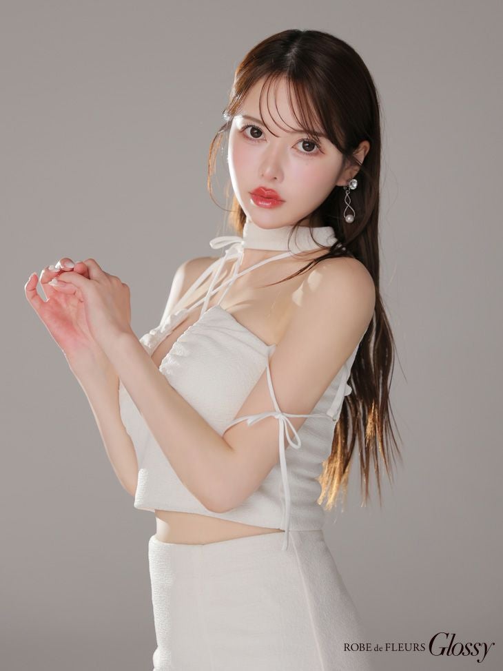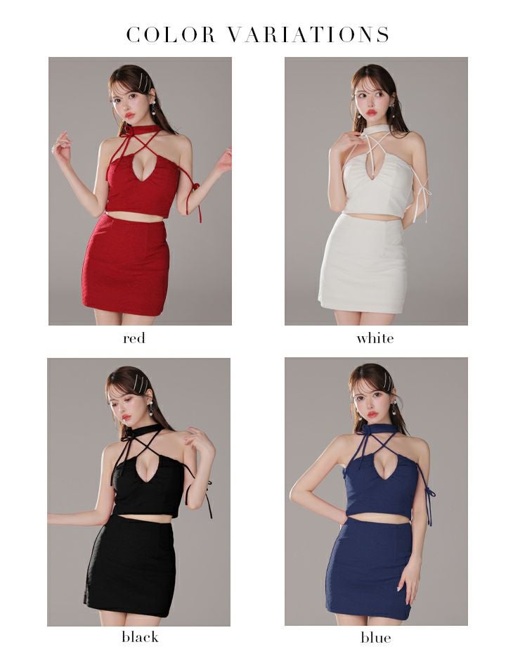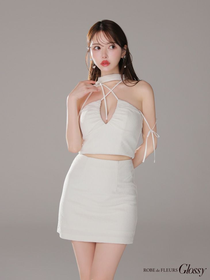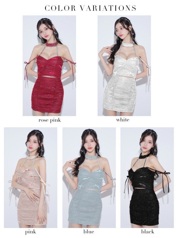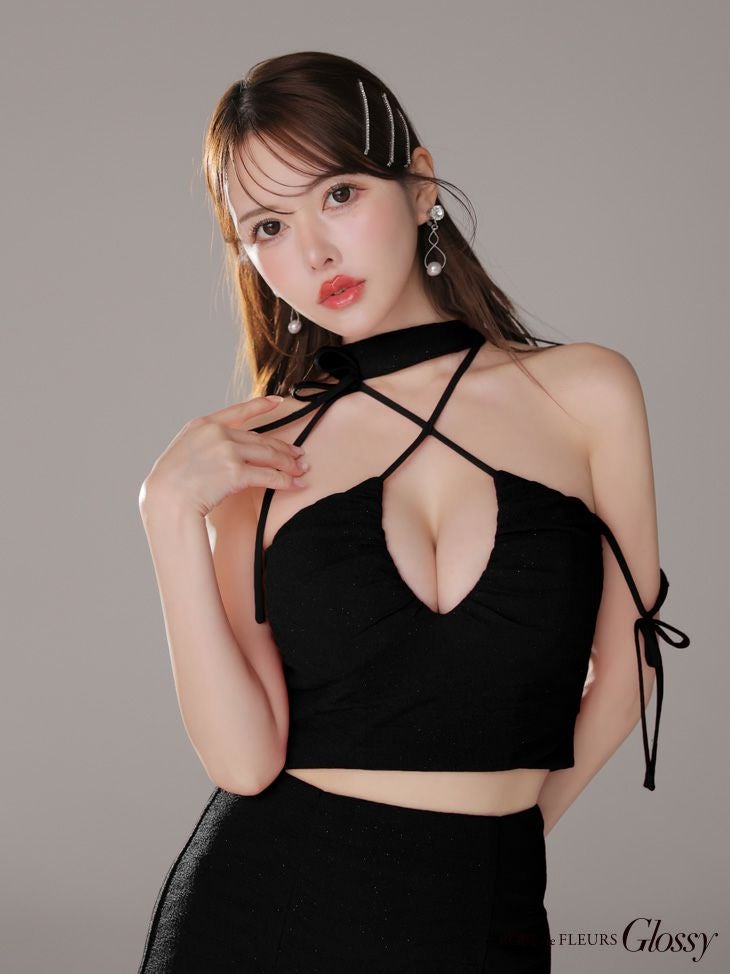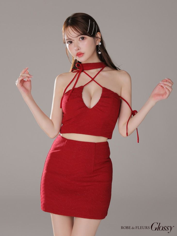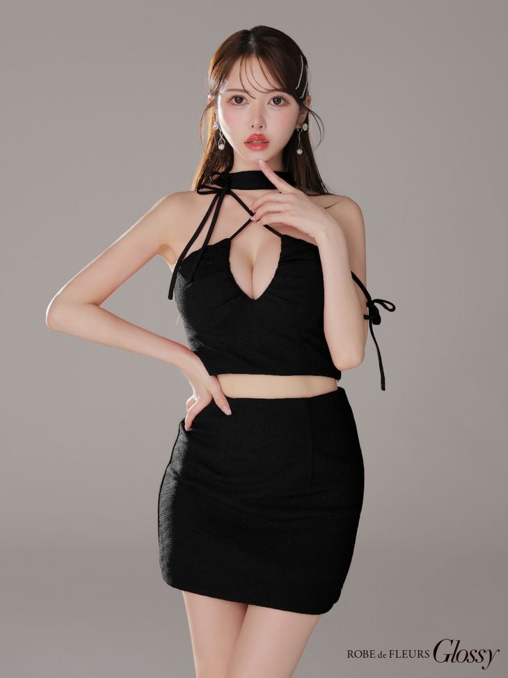 他の画像を見る 高級感溢れるデザインが魅力的☆ [ROBEdeFLEURSGlossy/ローブドフルールグロッシー] 高級 ホルターネック セットアップ リボン ラメ入り ワンカラー バストカット 谷間魅せ タイトミニドレス ¥ 29,480 税込 お気に入りに追加