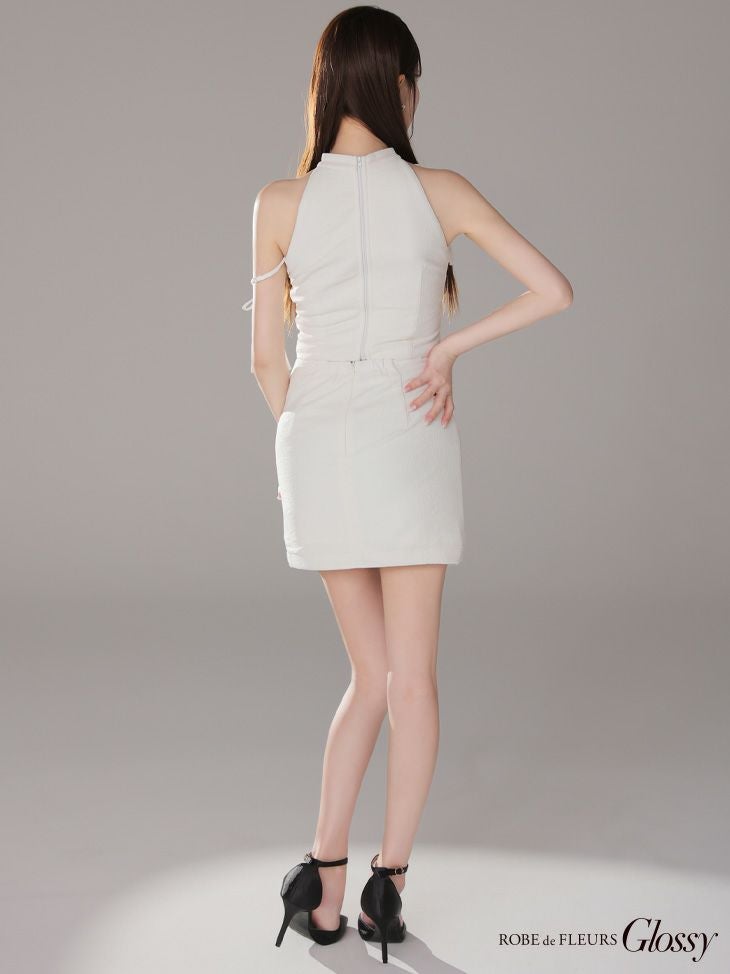他の画像を見る シンプルなワンカラーで魅力を引き出す☆ [ROBEdeFLEURSGlossy/ローブドフルールグロッシー] 高級 ホルターネック セットアップ リボン ラメ入り ワンカラー バストカット 谷間魅せ タイトミニドレス ¥ 29,480 税込 お気に入りに追加