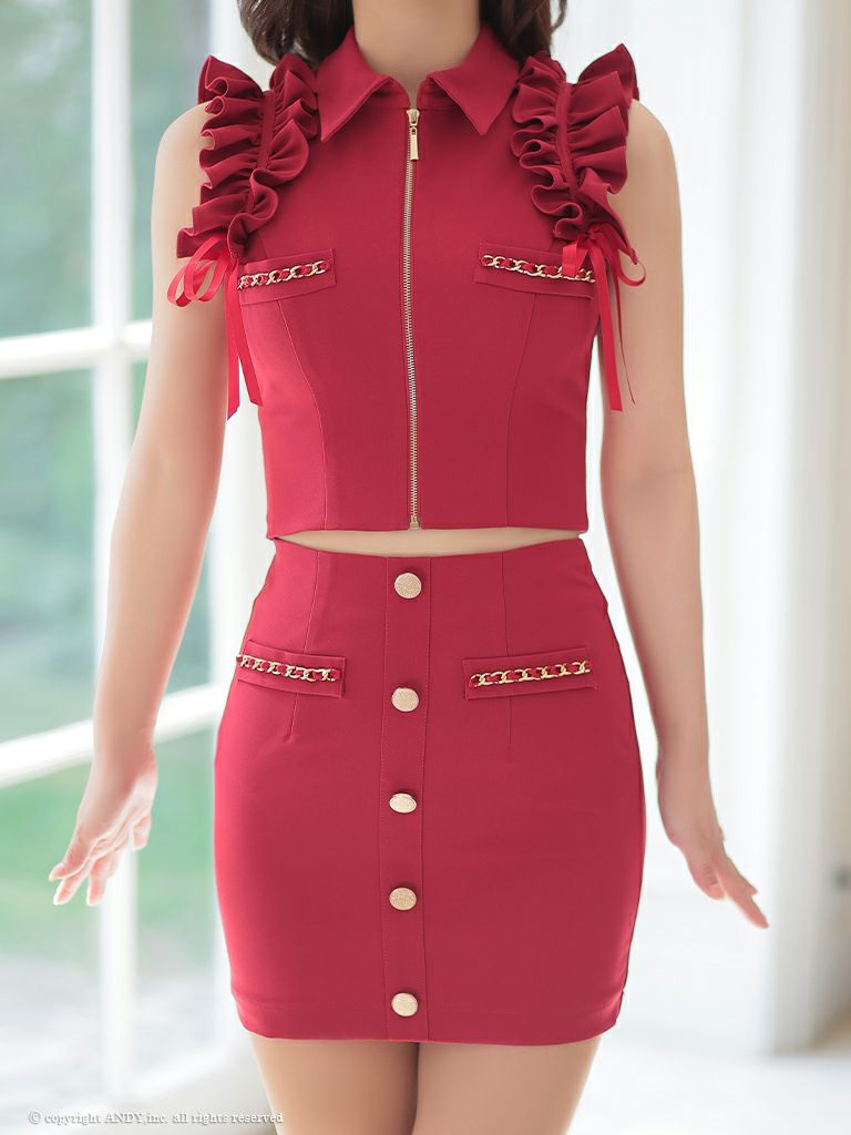 他の画像を見る フリルショルダーが可愛いセットアップ☆ [an/アン] 高級 フリルショルダー ノースリーブ セットアップ 襟付き ジップ チェーンボタン タイトミニドレス ¥ 28,600 税込 在庫切れ お気に入りに追加