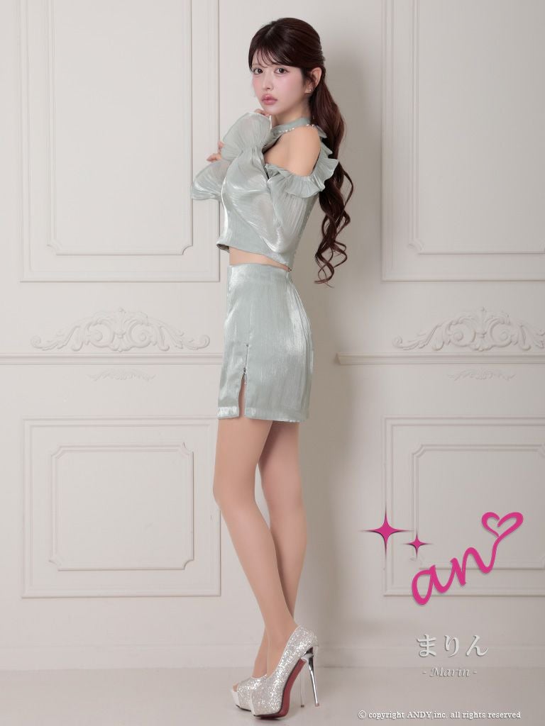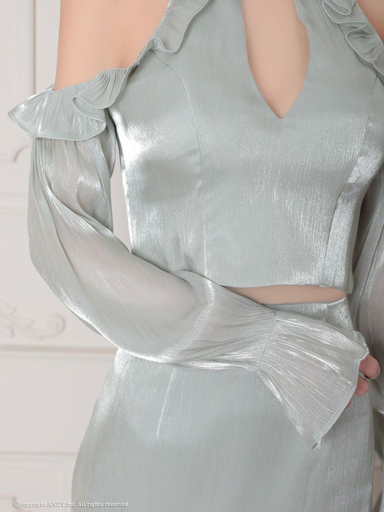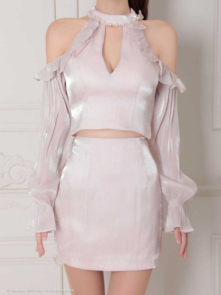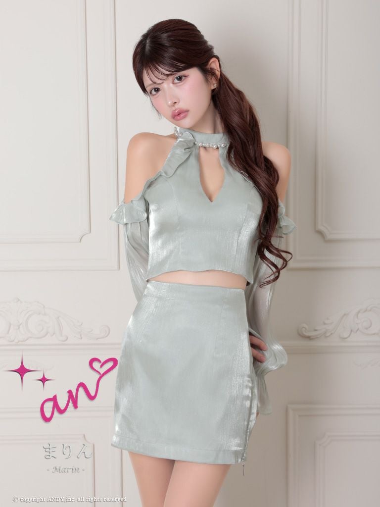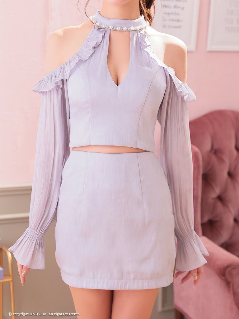 他の画像を見る シフォンの質感で高級感UP☆ [an/アン] 高級 ホルターネック セットアップ 肩出し 二の腕カバー 長袖 袖あり ジップ バストカット パール シフォン フリル 谷間魅せ タイトミニドレス ¥ 27,500 税込 在庫切れ お気に入りに追加