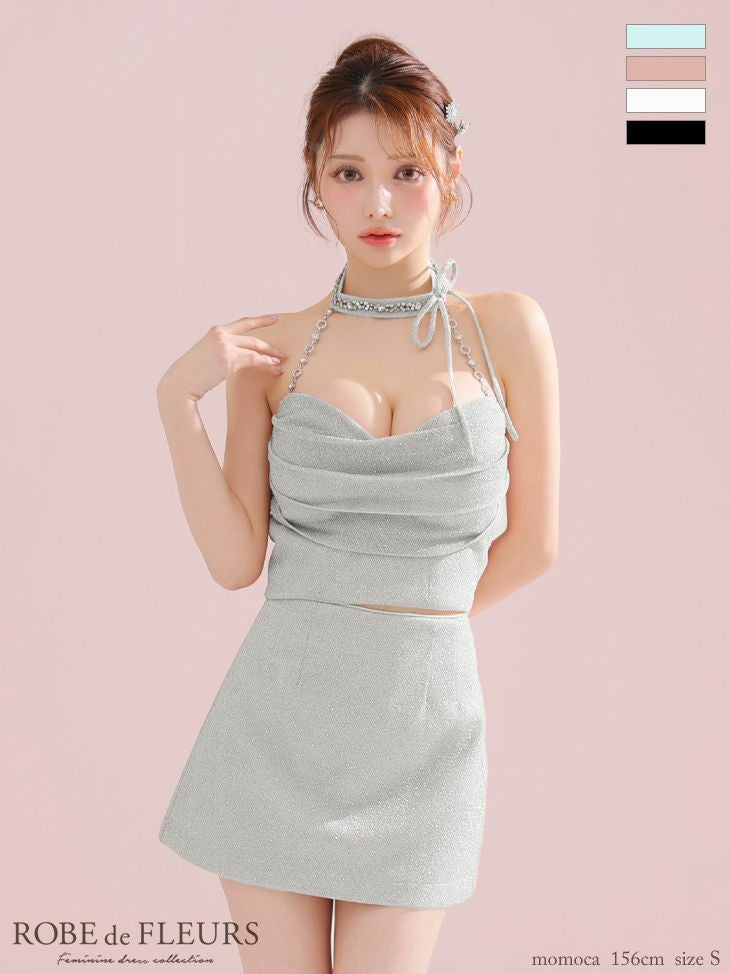 他の画像を見る シンプルながらも可愛さ溢れる♡ [ROBEdeFLEURS/ローブドフルール] 高級 ブランド タイトミニドレス セットアップ ホルターネック ビジュー リボン ラメニット ¥ 29,480 税込 在庫切れ お気に入りに追加