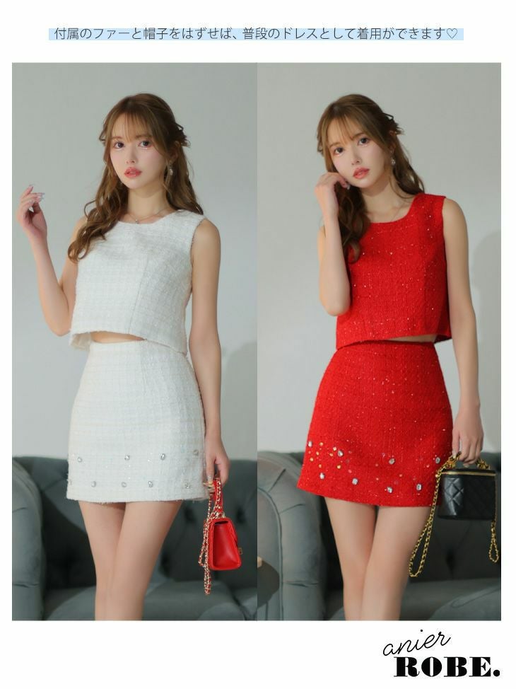 他の画像を見る ファーは取り外し可能で普段のドレスとしても着用OK☆ [ANIER./アニエル] 高級Luxury simple セットアップノースリーブツイードふわふわサンタコスプレ [ファー取り外し可能・帽子付] ¥ 30,580 税込 在庫切れ お気に入りに追加
