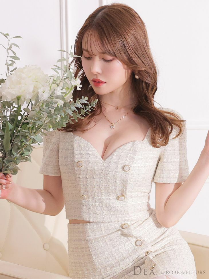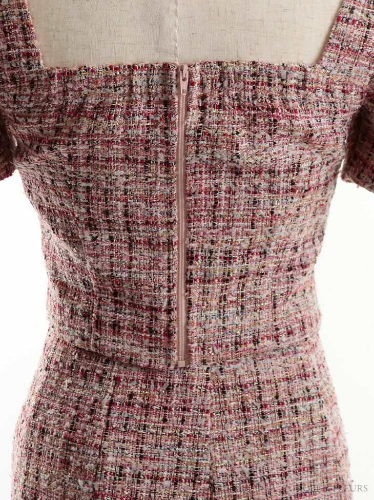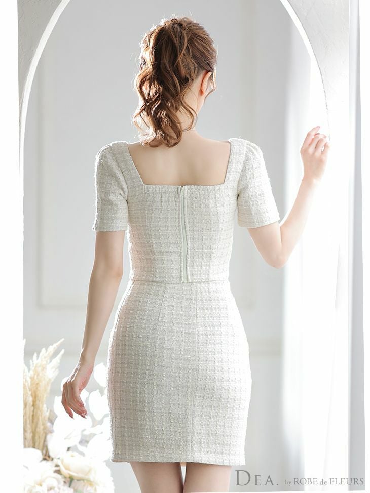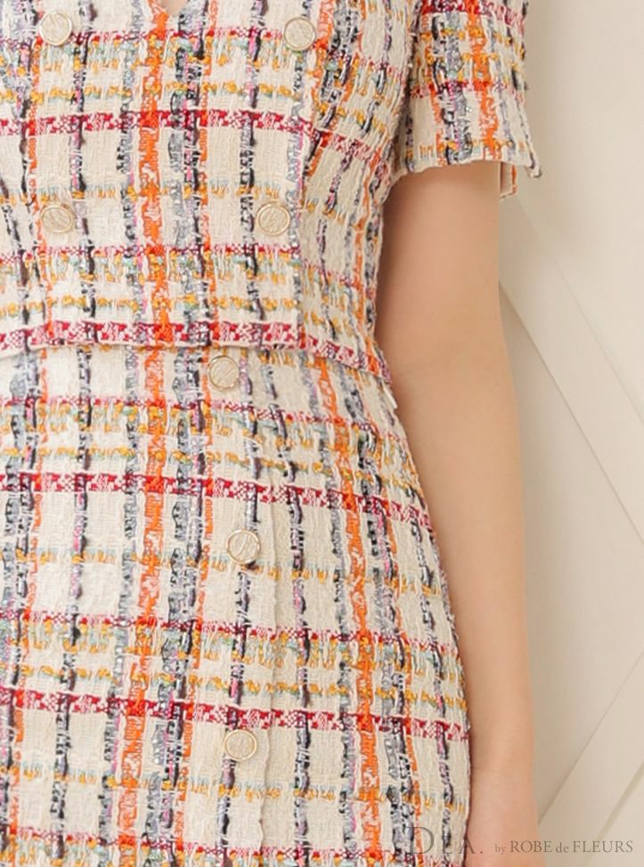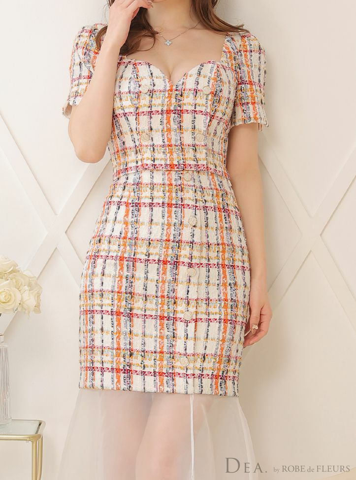 他の画像を見る 高級感あふれるツイードが目を惹く☆ [DEA.byROBEdeFLEURS/ディアバイローブドフルール] 高級ハートカットフロントボタンラメツイードセットアップ半袖タイト膝丈ドレス ¥ 29,480 税込 在庫切れ お気に入りに追加