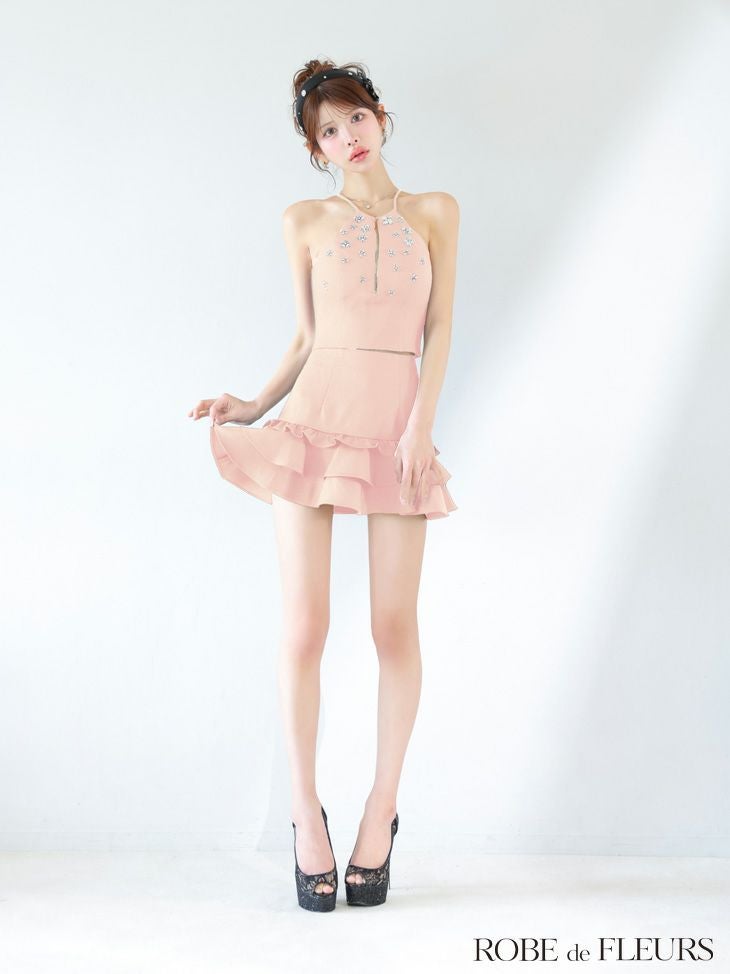 他の画像を見る フリルで可愛く美脚に導く♡ 予約商品【5月中旬入荷予定】[ROBEdeFLEURS/ローブドフルール] 高級 ブランド Aラインミニドレス セットアップ ホルターネック ジップ フリル ビジュー ¥ 29,480 税込 お気に入りに追加