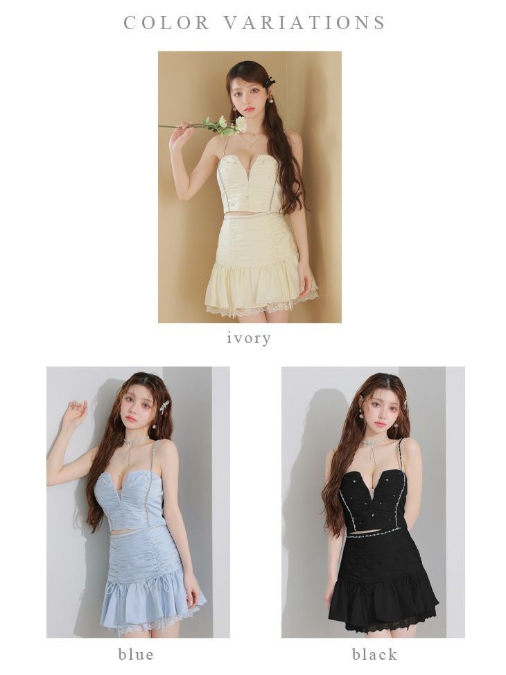 他の画像を見る たっぷりギャザーでスタイル盛れ♡ [ROBEdeFLEURS/ローブドフルール] 高級 キャミソール ビジュー サテン バストシースルー ギャザー セットアップ 裾フリル レース フレアミニドレス ¥ 32,780 税込 お気に入りに追加