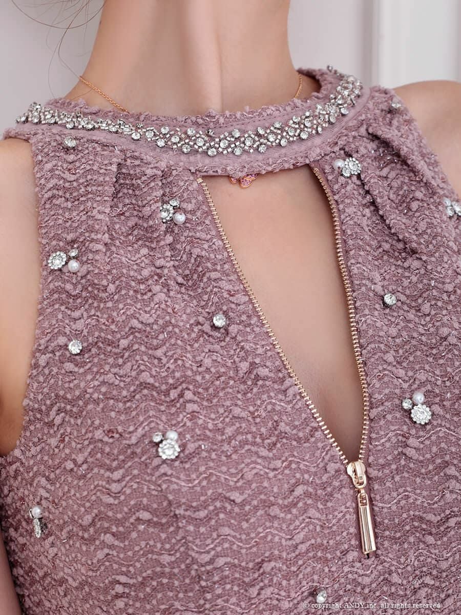 他の画像を見る ビジューリボンが可愛らしく彩る★ [an/アン] 高級 ノースリーブ ワンカラー セットアップ ジップデザイン スパンコール リボン プリーツ フレア ミニドレス ¥ 28,600 税込 お気に入りに追加