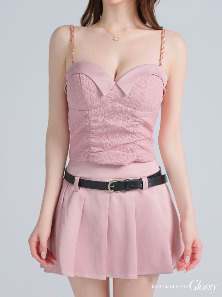他の画像を見る トレンド感満載のセットアップ♡ [ROBEdeFLEURSGlossy/ローブドフルールグロッシー] 高級 チェーンキャミソール ハートカット 谷間魅せ セットアップ ウエストベルト プリーツ フレアミニドレス ¥ 27,280 税込 お気に入りに追加