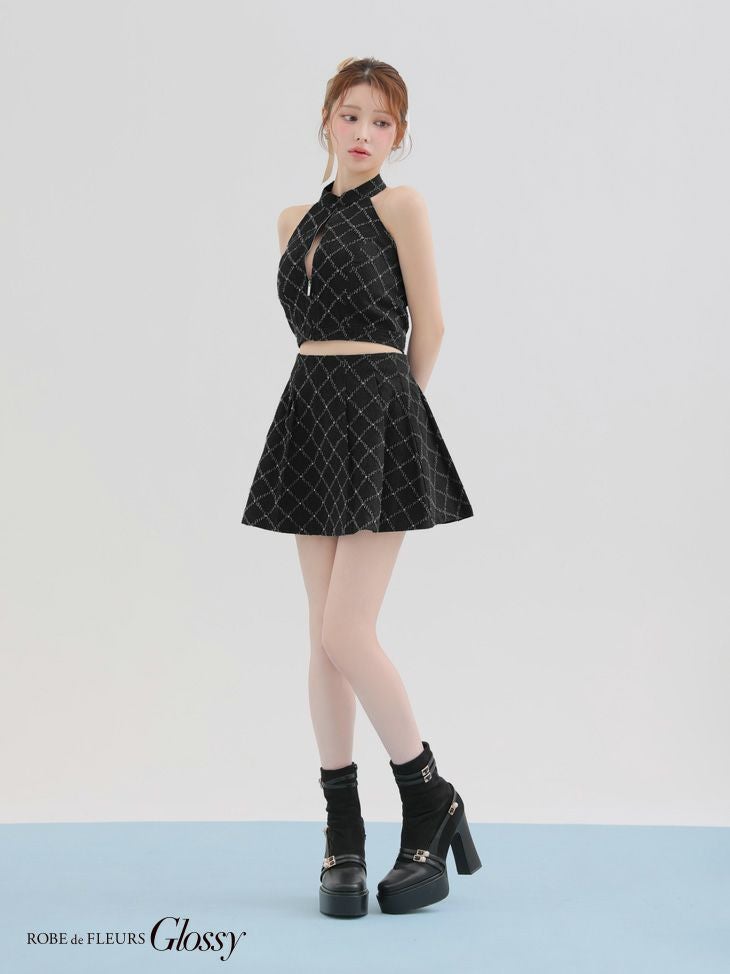他の画像を見る 大胆な肌魅せでセクシーに差をつける♡ [ROBEdeFLEURSGlossy/ローブドフルールグロッシー] 高級 ブランド タイトミニドレス セットアップ ホルターネック ツイード ジップ ストーン ¥ 27,280 税込 お気に入りに追加