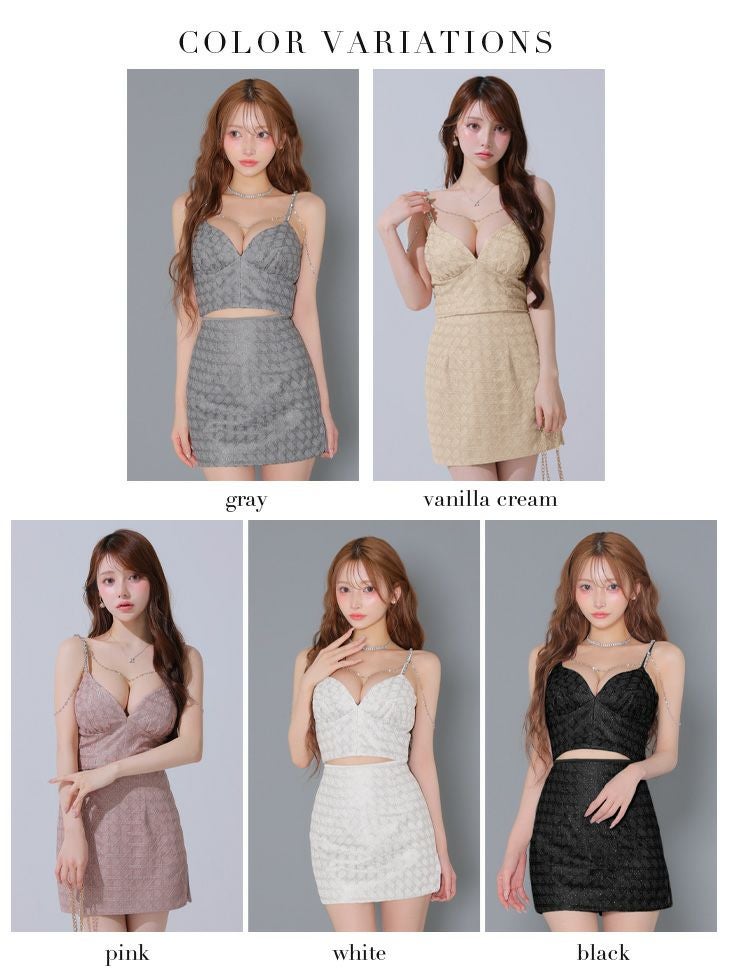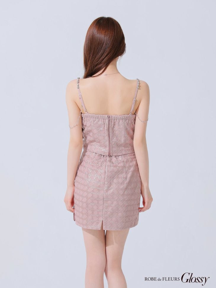 他の画像を見る 取り外しのできるチェーンでもっと可愛く♡ [ROBEdeFLEURSGlossy/ローブドフルールグロッシー] 高級 キャミソール ビジューチェーン付き セットアップ ラメチュール タイトミニドレス ¥ 29,480 税込 お気に入りに追加