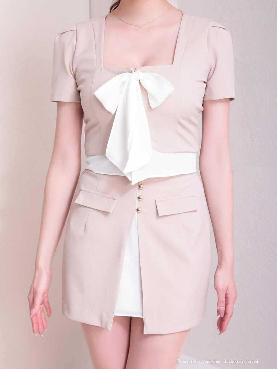 他の画像を見る シンプルなデザインにリボンがアクセント★ [Andy/アンディ] 高級 半袖 スクエアネック リボン スリット セットアップ ゴールドボタン タイトミニドレス ¥ 29,700 税込 お気に入りに追加