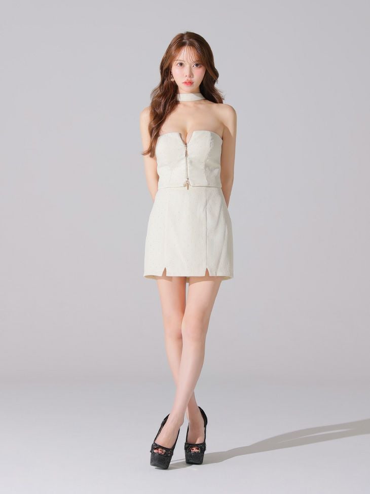 他の画像を見る セクシーさをたっぷり詰め込んだ1着♡ [ROBEdeFLEURSGlossy/ローブドフルールグロッシー] 高級 ブランド タイトミニドレス セットアップ ホルターネック ツイード ジップ ストーン ¥ 27,280 税込 お気に入りに追加