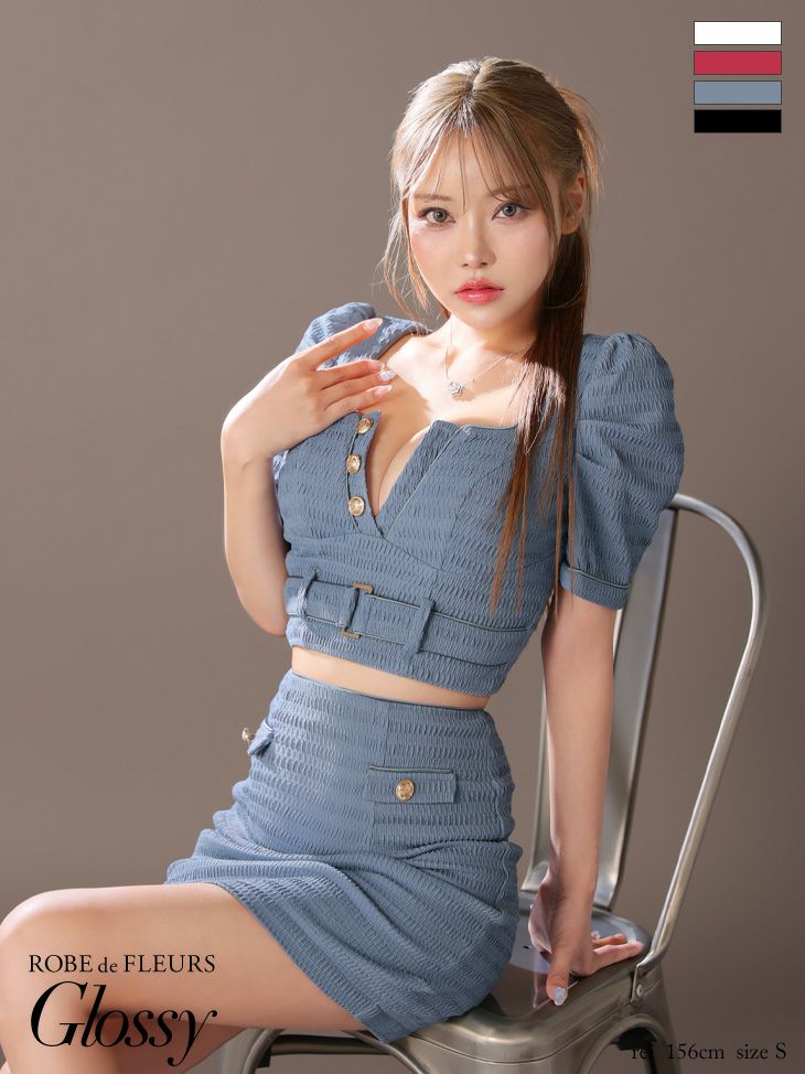 他の画像を見る シンプルなワンカラーで大人sexyに☆ [ROBEdeFLEURSGlossy/ローブドフルールグロッシー] 高級半袖セットアップウエストベルトボタンスクエアネックタイトミニドレス ¥ 29,480 税込 お気に入りに追加