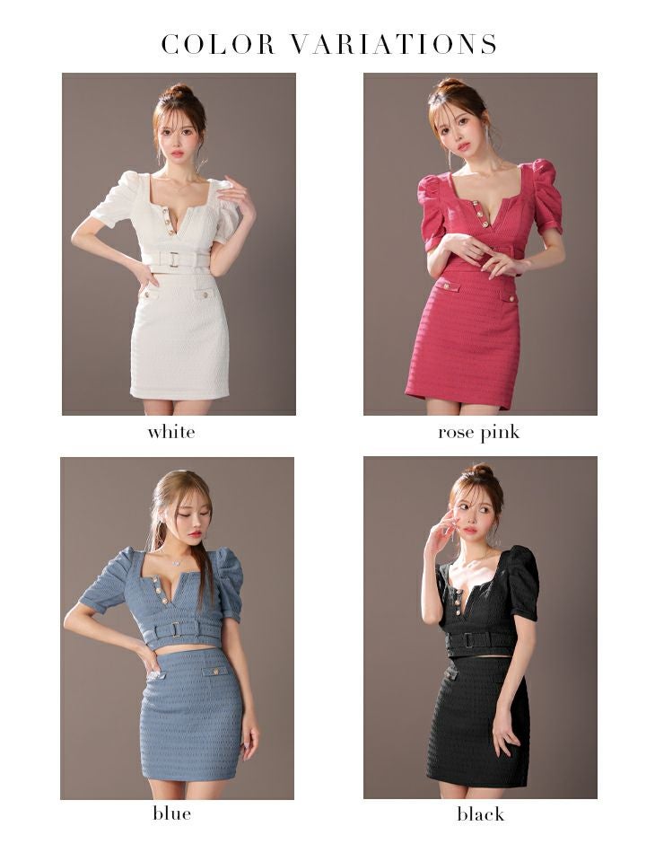 他の画像を見る デコルテ魅せで美しく☆ [ROBEdeFLEURSGlossy/ローブドフルールグロッシー] 高級半袖セットアップウエストベルトボタンスクエアネックタイトミニドレス ¥ 29,480 税込 お気に入りに追加