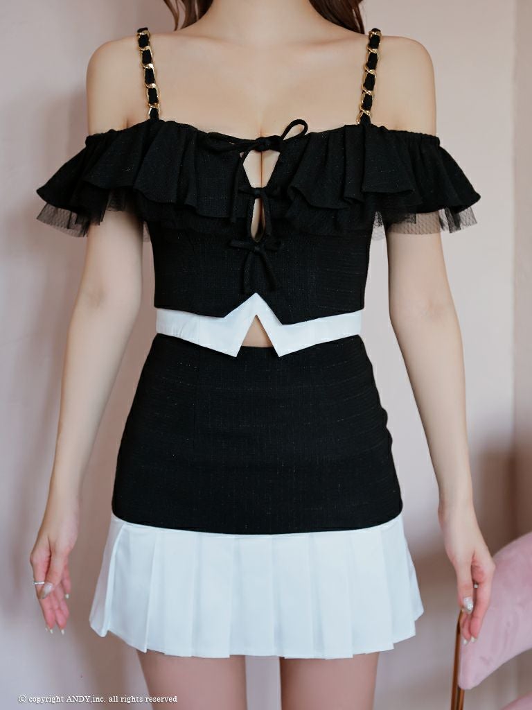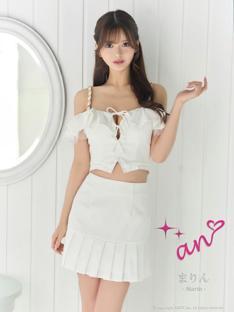 他の画像を見る ガーリーな印象のセットアップドレス☆ [an/アン] 高級 肩出し 二の腕カバー バストカット フリルチュール リボン プリーツ セットアップ 谷間魅せ フレアミニドレス ¥ 28,600 税込 お気に入りに追加