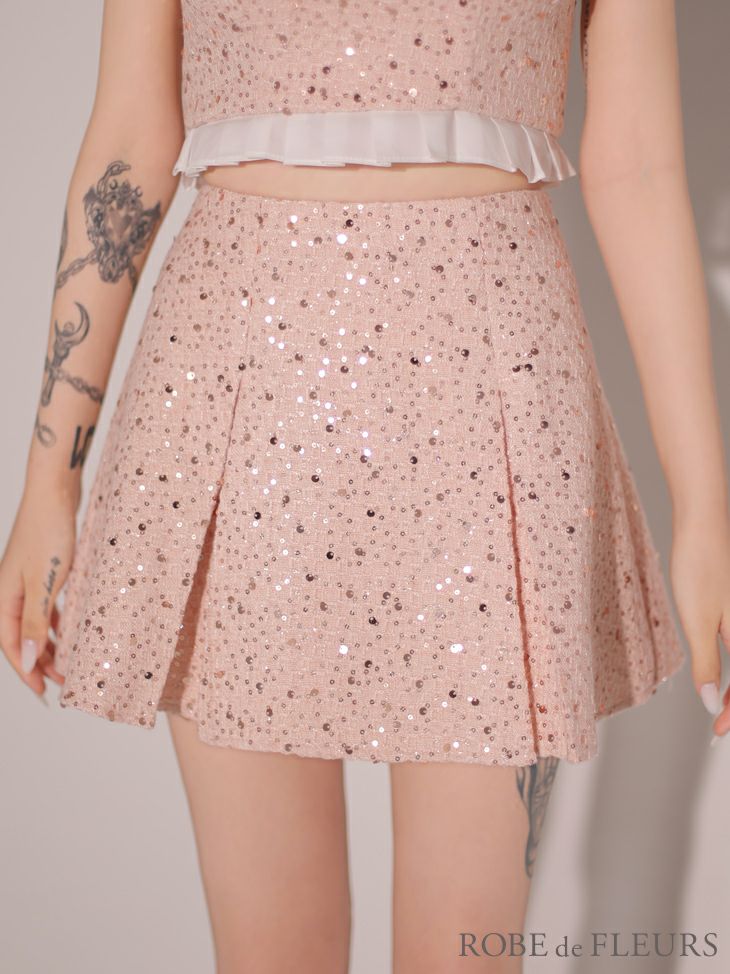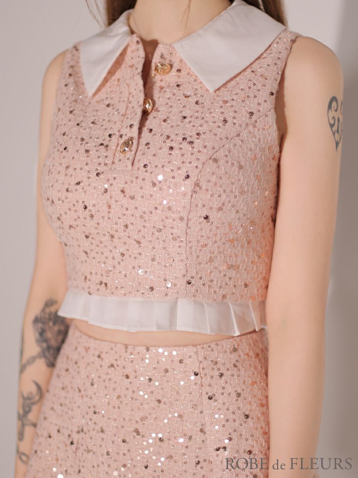 他の画像を見る トップスのフリルは取り外し可能☆ [ROBEdeFLEURS/ローブドフルール] 高級 ツイード ノースリーブ 襟付き セットアップ スパンコールボタン フレアミニドレス ¥ 29,480 税込 お気に入りに追加