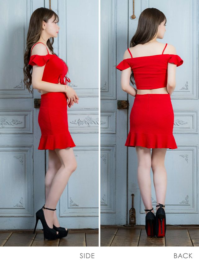 肩あきフロントジップリボンストレッチ裾フリルセットアップタイトミニドレスのカラーバリエーション