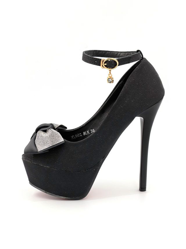 華やかなキラキラリボンデザイン♪ [ゲリラセール] アンクルストラップチャームビジュー付きキラキラリボンハイヒールオープントゥパンプス (ブラック) (14cmヒール)