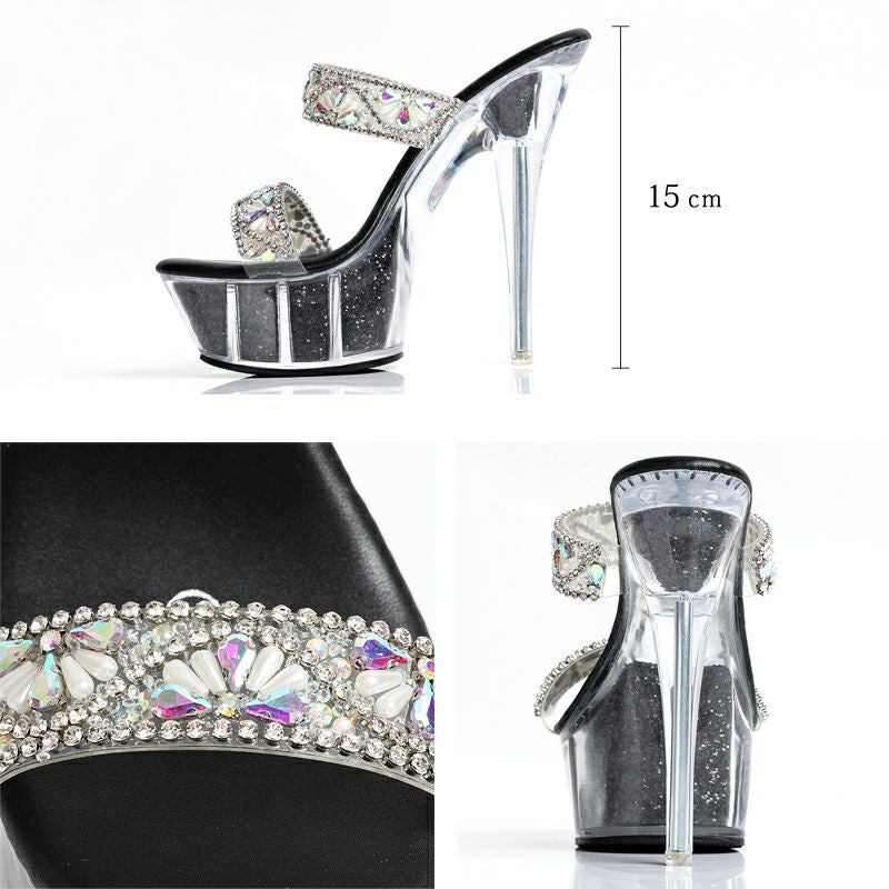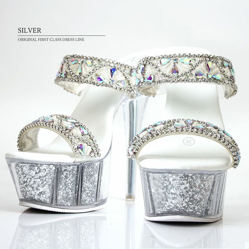 15cmヒール☆キラキラのビジューが足元から輝かせる [Angel-R/エンジェルアール] 高級キラキラフラワービジューオープントゥクリアサンダル