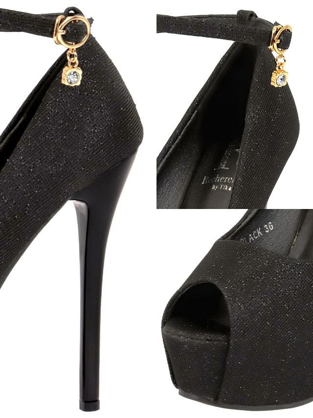 アンクルチャーム付きラメ入りブラックハイヒールオープントゥパンプス