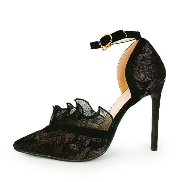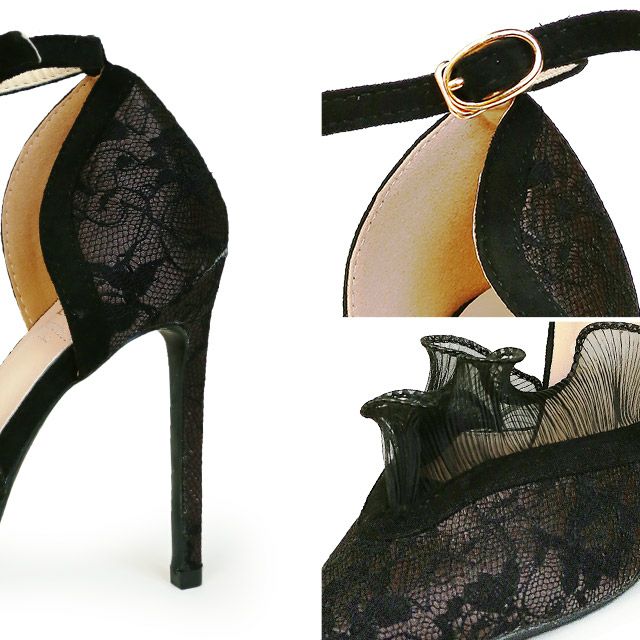 フリルレースがポイント♪ ブラックフリルアンクルストラップパンプス (ブラック×ブラウン) (11cmヒール)