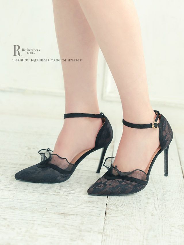 フリルレースがポイント♪ [SALE] ブラックフリルアンクルストラップパンプス (ブラック×ブラウン) (11cmヒール)