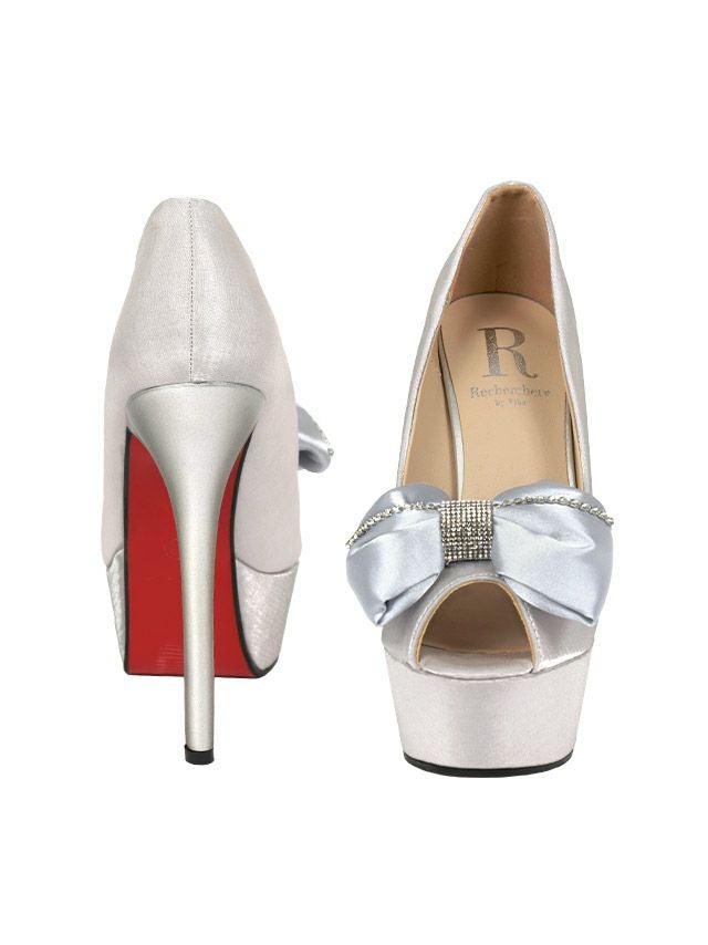 3. 立体リボンビジューハイヒールオープントゥパンプス (シルバー) (14cmヒール)