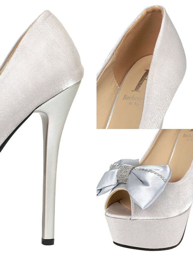 足元を可愛く華やかに演出♪ 立体リボンビジューハイヒールオープントゥパンプス (シルバー) (14cmヒール)