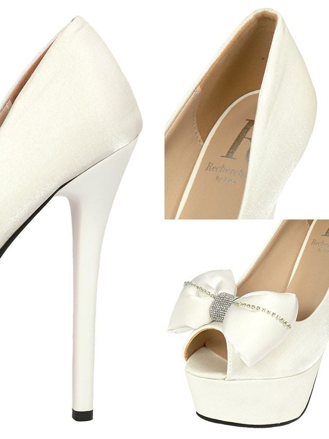 3. ビジュー付きビッグリボンハイヒールオープントゥパンプス (ホワイト) (14cmヒール)