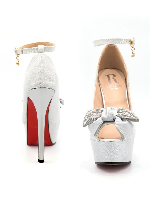 3. アンクルストラップチャーム付きグリッターリボンデザインハイヒールオープントゥパンプス (シルバー) (14cmヒール)