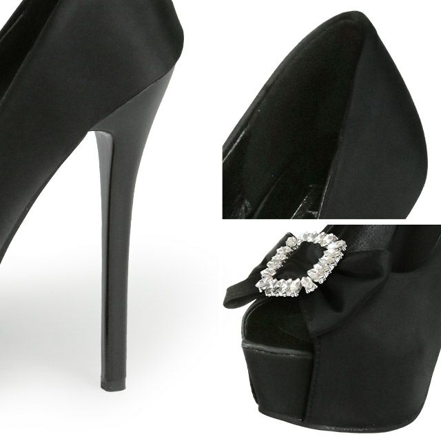 3. サテンビジューリボン付オープントゥパンプス (ブラック) (14cmヒール)