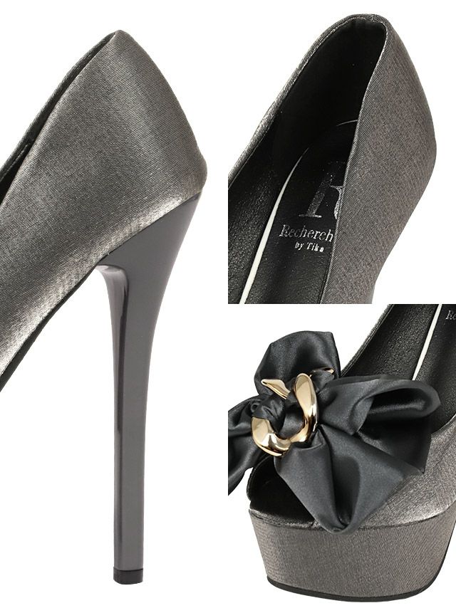 3. チェーンリボン付きサテンオープントゥパンプス (グレー) (14cmヒール)